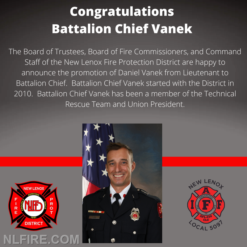 • Battalion Chief Daniel Vanek: Joining the District in 2010, Vanek saw a swift rise to leadership, earning a promotion to Lieutenant in 2012. In addition to his service on the Technical Rescue Team, Vanek has been a prominent leader within the organization, serving as Union President of the New Lenox Professional Firefighters Local 5097.