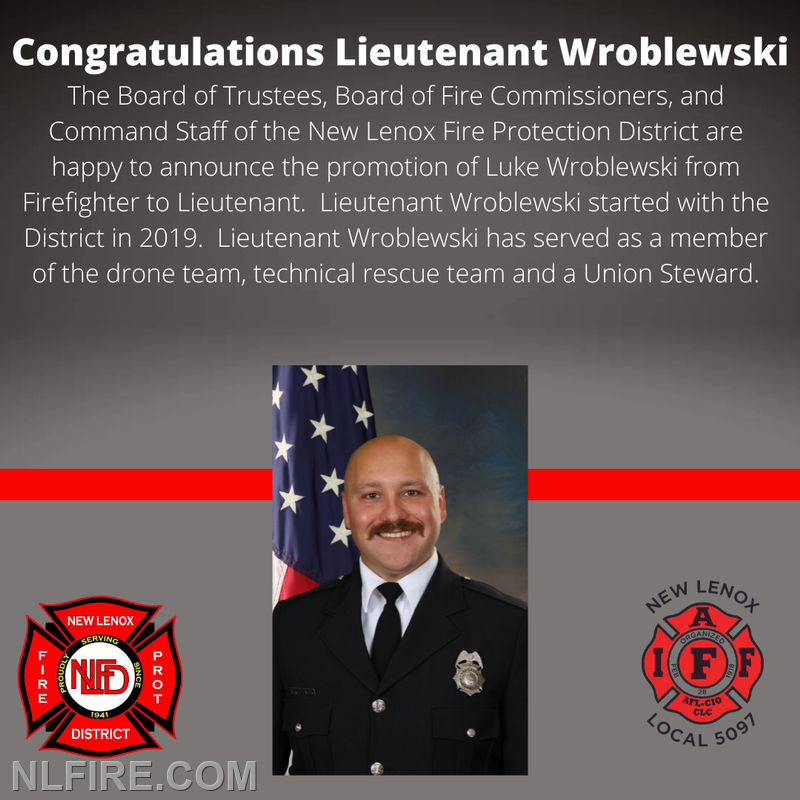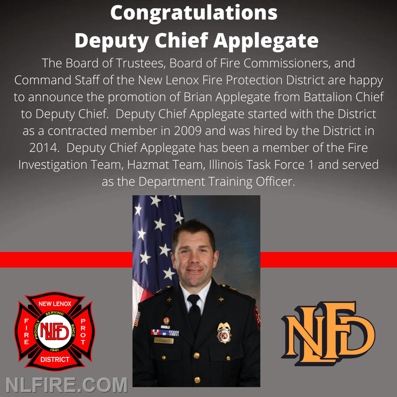 | The New Lenox Fire Protection District (NLFPD) Board of Commissioners is proud to announce the promotion of three dedicated members to its leadership ranks. Following the approval by the Commissioners to fill current vacancies, Brian Applegate has been promoted to Deputy Chief, Daniel Vanek to Battalion Chief, and Lucas Wroblewski to Lieutenant.